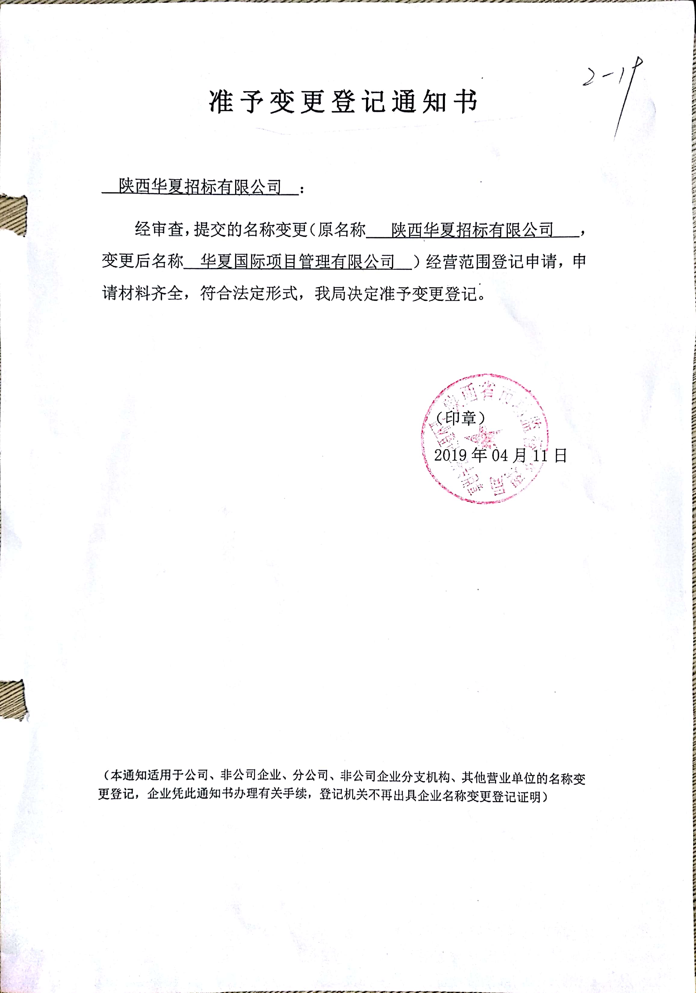 華夏國際項目管理有限公司系原陜西華夏招標有限公司,已于2019年4月1日正式經國家市場監督管理總局核準,依法將企業名稱變更(詳見(國)名稱變核內字【2019】第14109號通知書);2019年4月11日,完成公司名稱的變更(詳見陜西省市場監督管理局出具的準予變更登記通知書)。