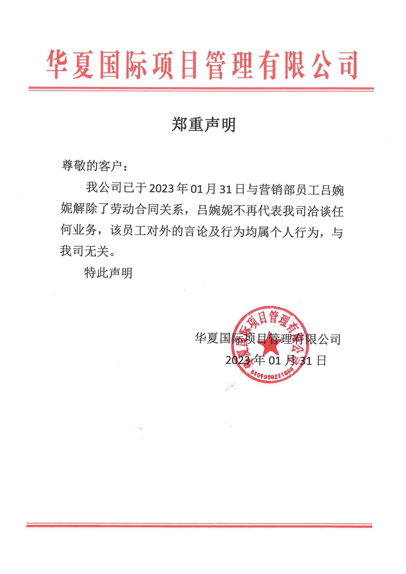我公司已于2023年01月31日與營銷部員工呂婉妮解除了勞動合同關(guān)系,呂婉妮不再代表我司洽談任何業(yè)務(wù),該員工對外的言論及行為均屬個人行為,與我司無關(guān)。